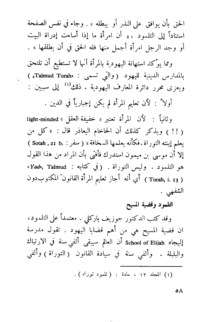 ومما يؤكد استهانة اليهودية بالمرأة أنها لا تستطيع أن تلتحق بالمدارس الدينية لليهود "والتي تسمَّى: "Talmud Torah" ويعزي محرر دائرة المعارف اليهودية ذلك1 إلى سببين: