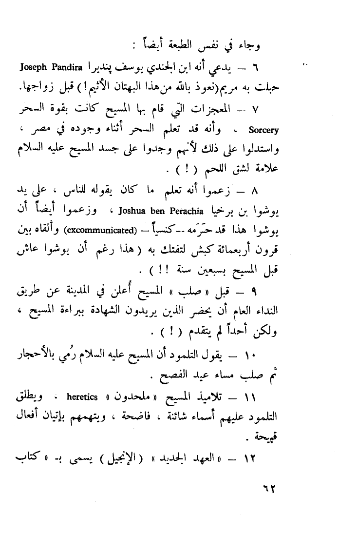 6- يدّعي أنّه ابن الجندي يوسف بنديرا JOSEPH PANDIRA حبلت به مريم "نعوذ بالله من هذا البهتان الأثيم! " قبل زواجها.
