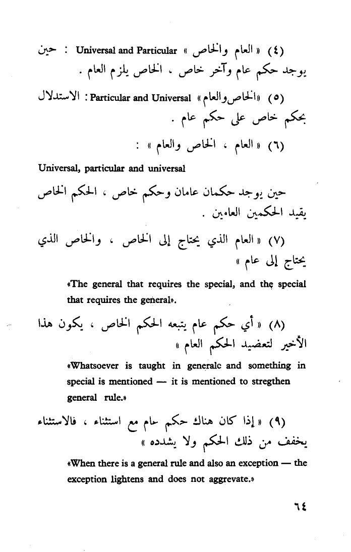4- العام والخاص Universal and Particular: حين يوجد حكم عام وآخر خاص، الخاص يلزم العام.