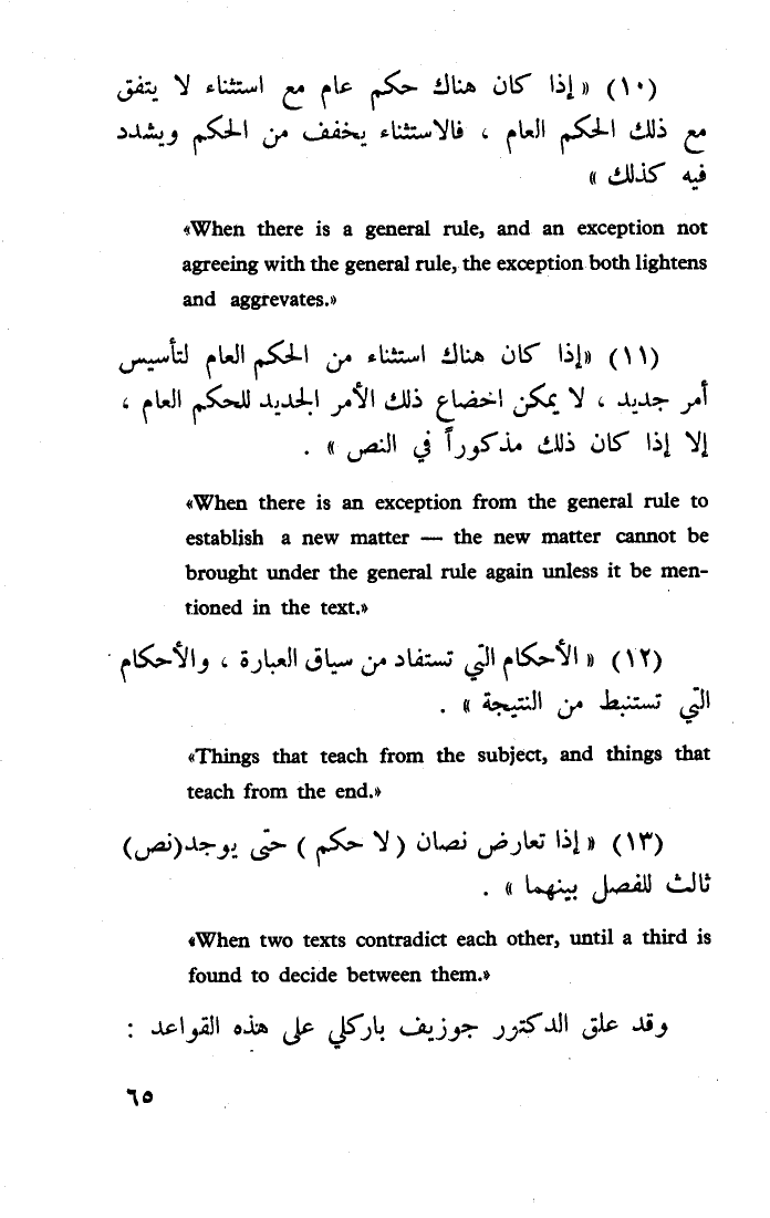 11- "إذا كان هناك استثناء من الحكم العام لتأسيس أمر جديد لا يمكن إخضاع ذلك الأمر الجديد للحكم العام، إلّا إذا كان ذلك مذكورًا في النص".