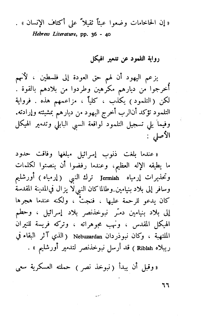 "عندما بلغت ذنوب إسرائيل مبلغها، وفاقت حدود ما يطيقه الإله العظيم، وعندما رفضوا أن ينصتوا لكلمات وتحذيرات إرمياه Jermiah ترك النبي "إرمياه" أورشليم، وسافر إلى بلاد بنيامين. وطالما كان النبي لا يزال في المدينة المقدسة كان يدعو للرحمة عليها فنجت، ولكنه عندما هجرها إلى بلاد بنيامين دمر نبوخذ نصر بلاد إسرائيل، وحطم الهيكل المقدس، ونهب مجوهراته، وتركه فريسة للنيران الملتهبة، وكان نبوذر دان Nabuzardan "الذي آثر البقاء في ريبلاه Riblah" قد أرسل نبوخذ نصر لتدمير أورشليم".