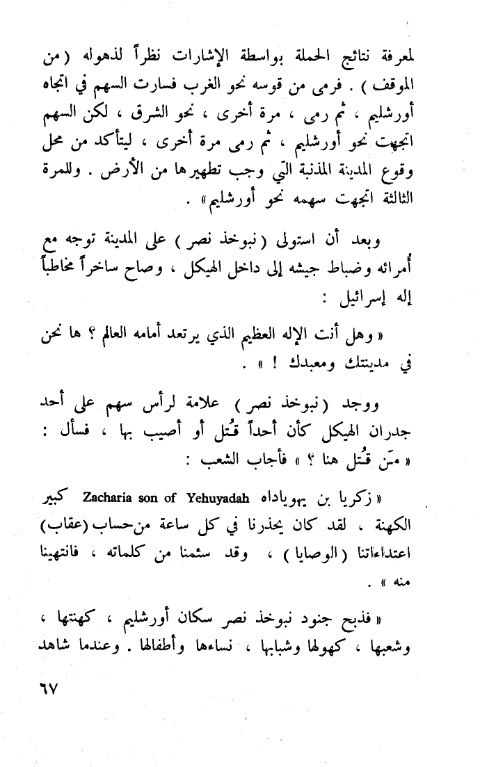 ووجد "نبوخذ نصر" علامة لرأس سهم على أحد جدران الهيكل كأنَّ أحدًا قتل أو أصيب بها، فسأل: "من قتل هنا؟ " فأجاب الشعب: