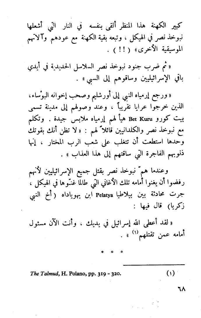 كبير الكهنة هذا المنظر ألقى بنفسه في النار التي أشعلها نبوخذ نصر في الهيكل، وتبعه بقية الكهنة مع عودهم وآلاتهم الموسيقية الأخرى".