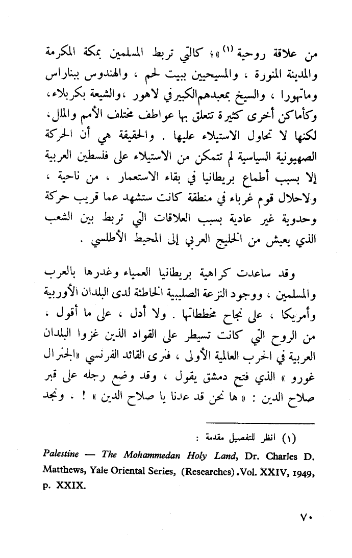 من علاقة روحية1 كالتي تربط المسلمين بمكة المكرمة والمدينة المنورة، والمسيحيين ببيت لحم، والهندوس ببناراس وماتهورا، والسيخ بمعبدهم الكبير في لاهور، والشيعة بكربلاء، وكأماكن أخرى كثيرة تتعلق بها عواطف مختلف الأمم والملل، لكنها لا تحاول الاستيلاء عليها، والحقيقة هي أن الحركة الصهيونية السياسية لم تتمكن من الاستيلاء على فلسطين العربية إلا بسبب أطماع بريطانيا في بقاء الاستعمار من ناحية، ولإحلال قوم غرباء في منطقة كانت ستشهد عمّا قريب حركة وحدوية غير عادية بسبب العلاقات التي تربط بين الشعب الذي يعيش من الخليج العربي إلى المحيط الأطلسي.