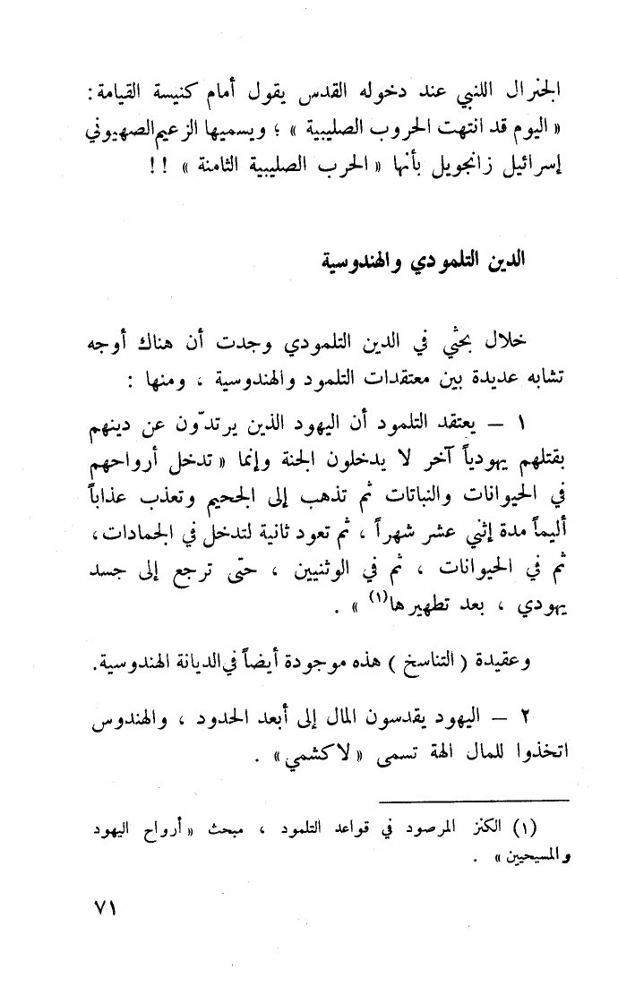 1- يعتقد التلمود أن اليهود الذين يرتدون عن دينهم بقتلهم يهوديًّا آخر لا يدخلون الجنة، وإنما "تدخل أرواحهم في الحيوانات والنباتات، ثم تذهب إلى الجحيم وتعذب عذابًا أليمًا مدة اثنى عشر شهرًا، ثم تعود ثانية لتدخل في الجمادات، ثم في الحيوانات، ثم في الوثنيين، حتى ترجع إلى جسد يهودي بعد تطهيرها1".
