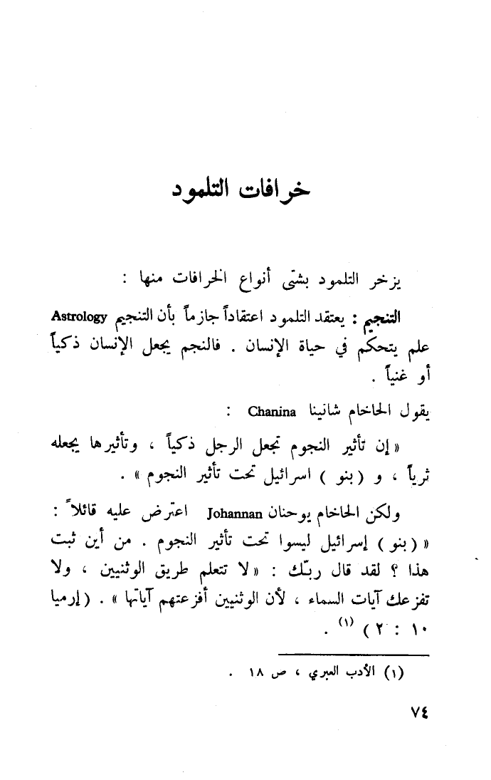 ولكن الحاخام يوحنان Johannan اعترض عليه قائلًا: "بنو" إسرائيل ليسوا تحت تأثير النجوم، من أين ثبت هذا؟ لقد قال ربك: "لا تتعلم طريق الوثنيين، ولا تفزعك آيات السماء، لأن الوثنيين أفزعتهم آياتها". "إرميا 10: 2"1.