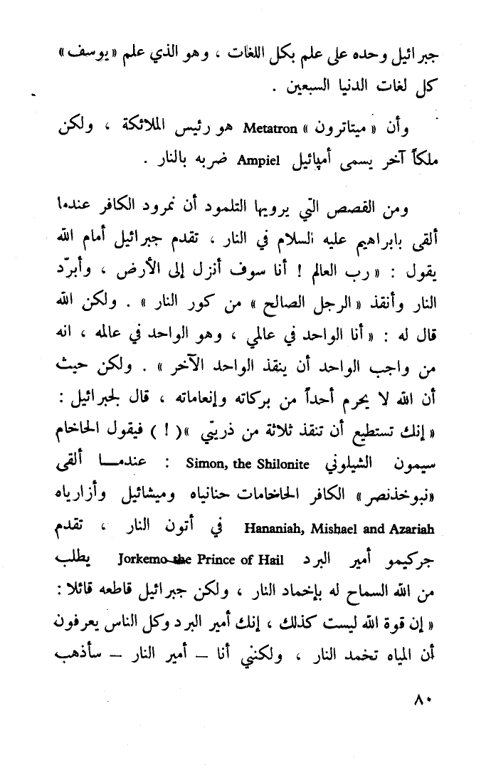 وأنّ "ميتاترون "Metatron هو رئيس الملائكة، ولكن ملكًا آخر يسمى أميائيل Ampiel ضربة بالنار.