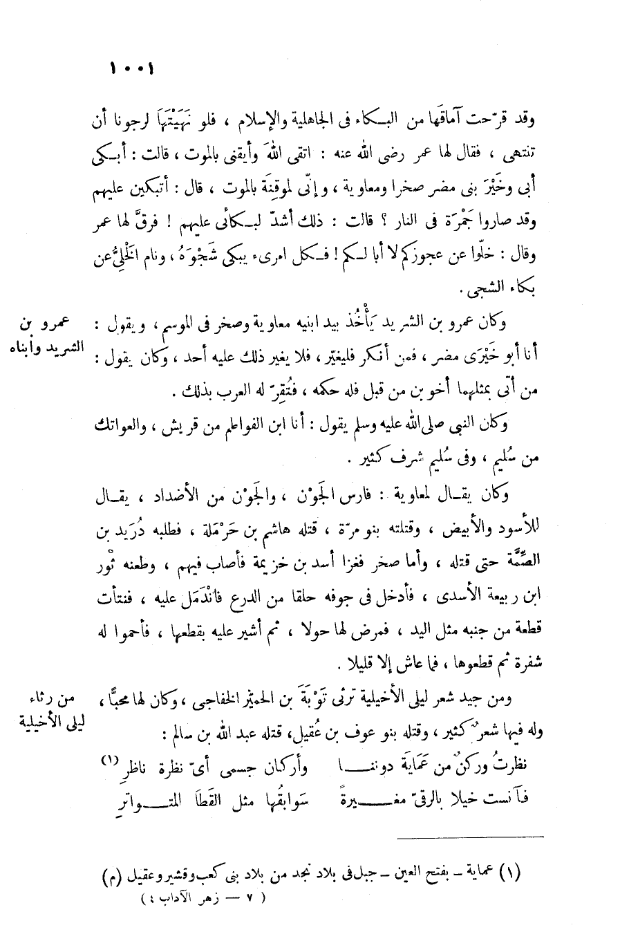 وقد قرّحت آماقها من البكاء فى الجاهلية والإسلام، فلو نهيتها لرجونا أن تنتهى، فقال لها عمر رضى الله عنه: اتقى الله وأيقنى بالموت، قالت: أبكى أبى وخير بنى مضر صخرا ومعاوية، وإنّى لموقنة بالموت، قال: أتبكين عليهم وقد صاروا جمرة فى النار؟ قالت: ذلك أشدّ لبكائى عليهم! فرقّ لها عمر وقال: خلّوا عن عجوزكم لا أبا لكم! فكل امرىء يبكى شجوه، ونام الخلىّ عن بكاء الشجى.