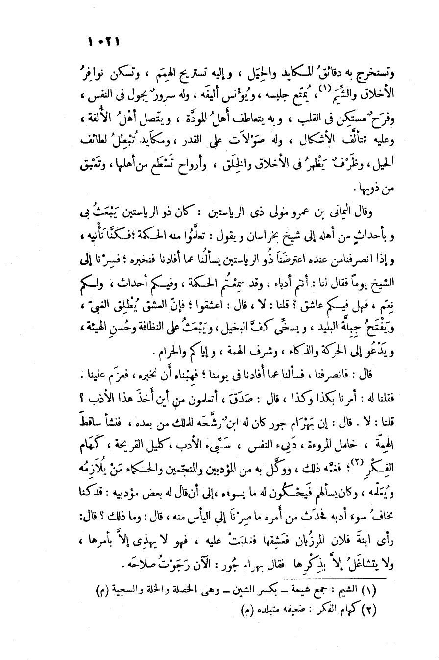 وتستخرج به دقائق المكايد والحيل، وإليه تستريح الهمم، وتسكن نوافر الأخلاق والشّيم «1» ، يمتّع جليسه، ويؤنس أليفه، وله سرور يجول فى النفس، وفرح مستكن فى القلب، وبه يتعاطف أهل المودّة، ويتّصل أهل الألفة، وعليه تتألّف الأشكال، وله صولات على القدر، ومكايد تبطل لطائف الحيل، وظرف يظهر فى الأخلاق والخلق، وأرواح تسطع من أهلها، وتعبق من ذويها.