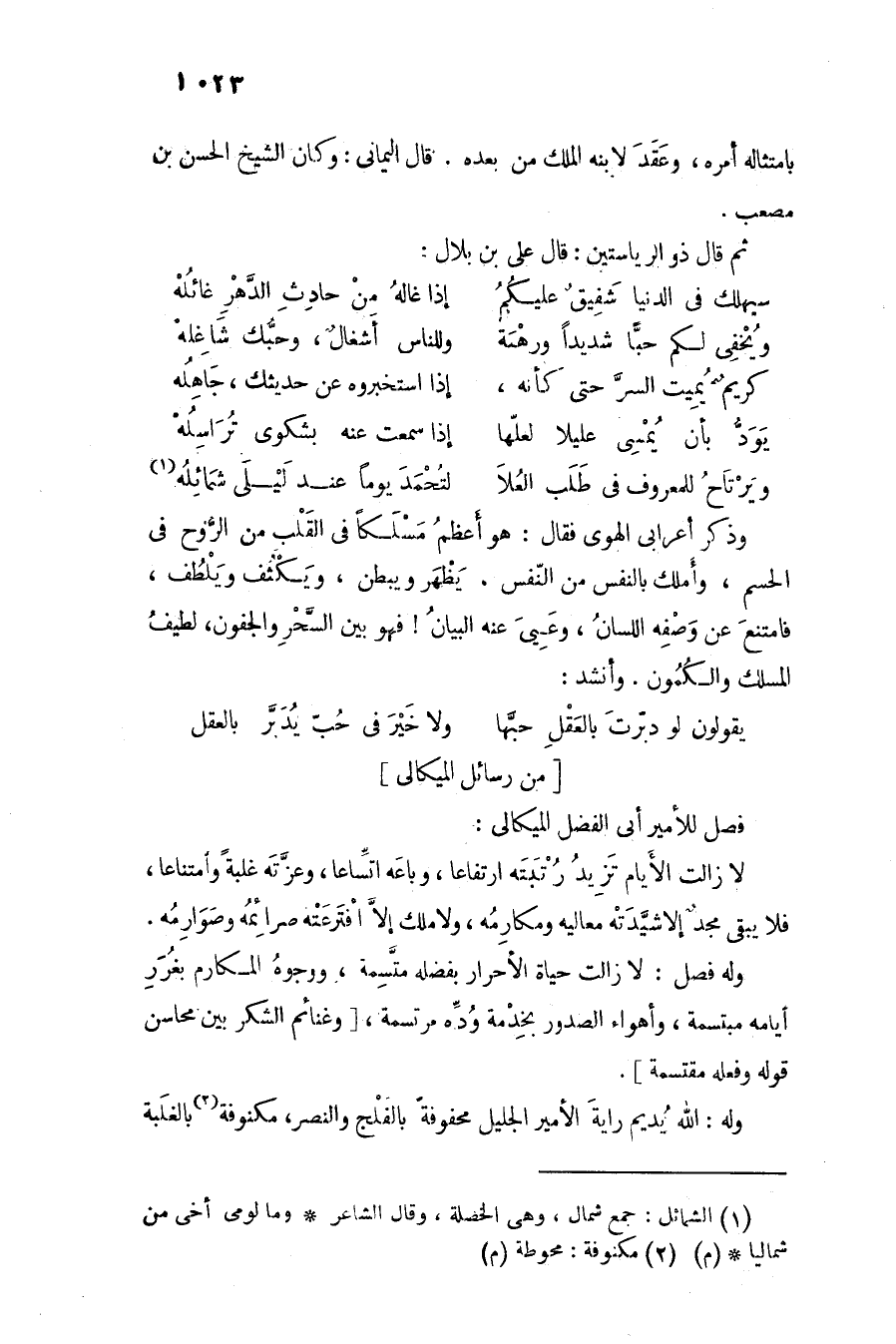 لا زالت الأيام تزيد رتبته ارتفاعا، وباعه اتّساعا، وعزّته غلبة وامتناعا، فلا يبقى مجد إلا شيّدته معاليه ومكارمه، ولا ملك إلّا افترعته صرائمه وصوارمه.