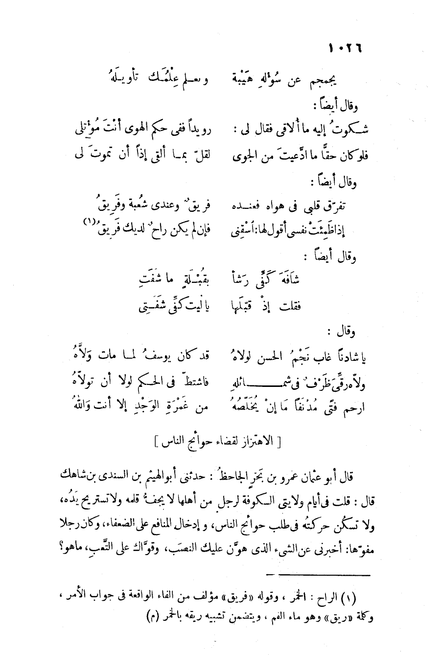 قال أبو عثمان عمرو بن بحر الجاحظ: حدثنى أبو الهيثم بن السندى بن شاهك قال: قلت فى أيام ولايتى الكوفة لرجل من أهلها لا يجفّ قلمه ولا تستريح يده، ولا تسكن حركته فى طلب حوائج الناس، وإدخال المنافع على الضعفاء، وكان رجلا مفوّها: أخبرنى عن الشىء الذى هوّن عليك النصب، وقوّاك على التّعب، ما هو؟