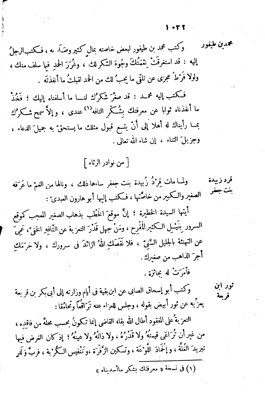 وكتب محمد بن طيفور لبعض خاصته بمال كثير وصل به، فكتب الرجل إليه: قد استغرقت نعمتك وجوه الشكر لك، وغرر الحمد فيما سلف منك، ولولا فرط عجزى عن تلقّى ما يجب لك من الحمد لقبلت ما أنفذته.