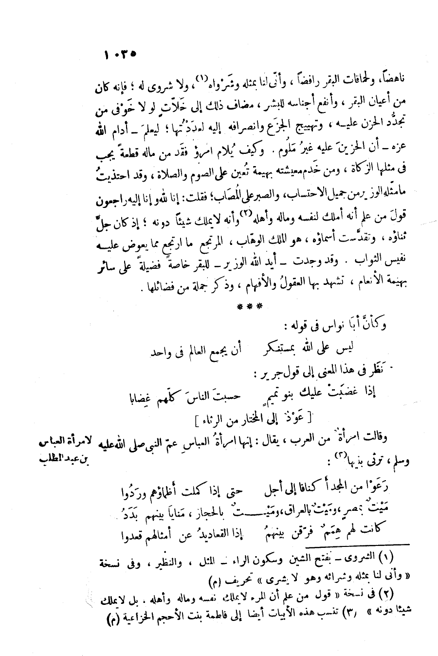 ناهضا، ولحماقات البقر رافضا، وأنّى لنا بمثله وشرواه «1» ، ولا شروى له؛ فإنه كان من أعيان البقر، وأنفع أجناسه للبشر، مضاف ذلك إلى خلّات لولا خوفى من تجدّد الحزن عليه، وتهييج الجزع وانصرافه إليه لعددتها؛ ليعلم- أدام الله عزه- أن الحزين عليه غير ملوم. وكيف يلام امرؤ فقد من ماله قطعة يجب فى مثلها الزكاة، ومن خدم معيشته بهيمة تعين على الصوم والصلاة، وقد احتذيت ما مثّله الوزير من جميل الاحتساب، والصبر على المصاب؛ فقلت: إنا لله وإنا إليه راجعون قول من علم أنه أملك لنفسه وماله وأهله «2» وأنه لا يملك شيئا دونه؛ إذ كان جلّ ثناؤه، وتقدّست أسماؤه، هو الملك الوهّاب، المرتجع ما ارتجع مما يعوض عليه نفيس الثواب. وقد وجدت- أيد الله الوزير- للبقر خاصة فضيلة على سائر بهيمة الأنعام، تشهد بها العقول والأفهام، وذكر جملة من فضائلها.