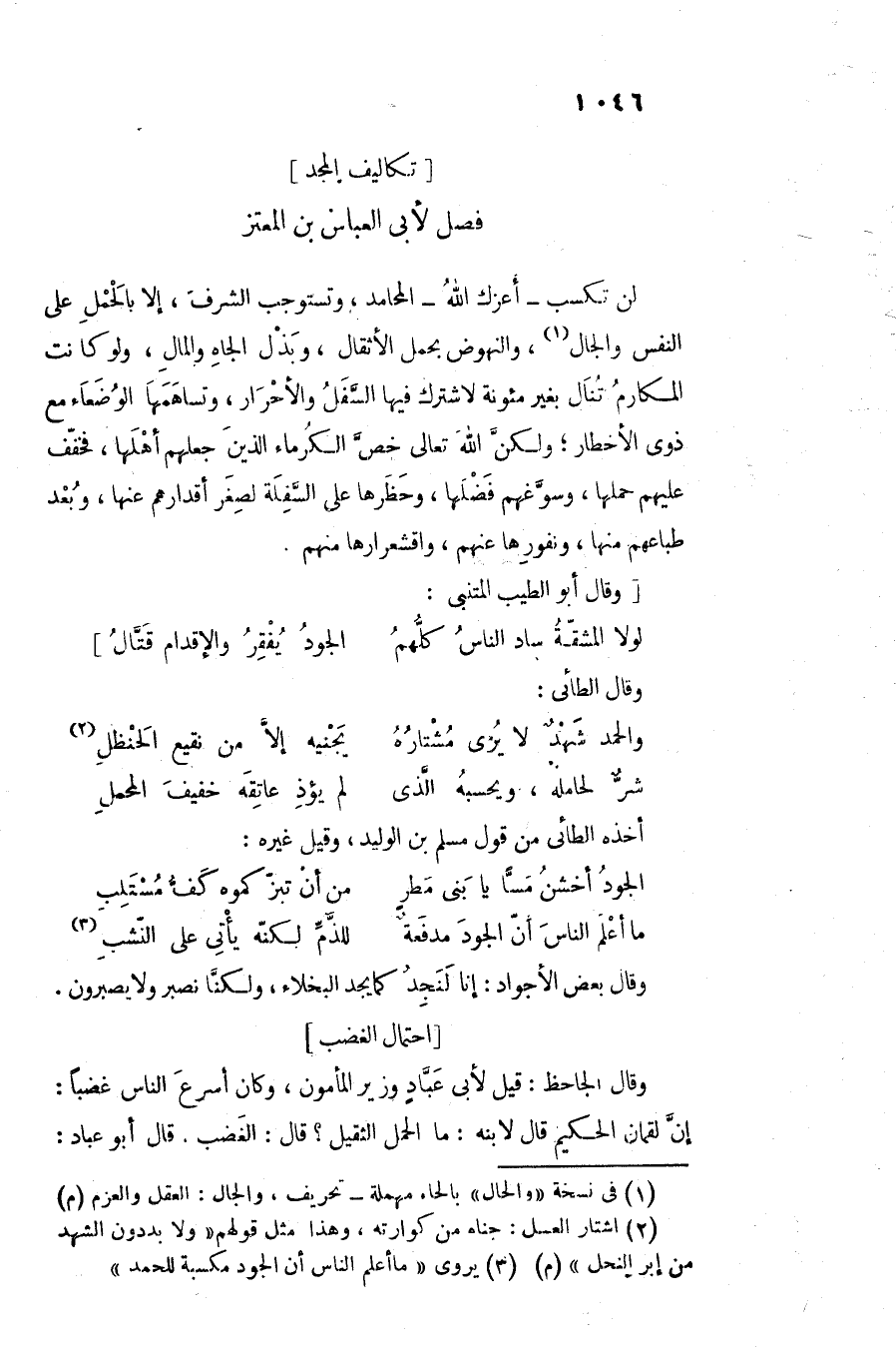 فصل لأبى العباس بن المعتز لن تكسب- أعزك الله- المحامد، وتستوجب الشرف، إلا بالحمل على النفس والجال «1» ، والنهوض بحمل الأثقال، وبذل الجاه والمال، ولو كانت المكارم تنال بغير مئونة لاشترك فيها السّفل والأحرار، وتساهمها الوضعاء مع ذوى الأخطار؛ ولكنّ الله تعالى خصّ الكرماء الذين جعلهم أهلها، فخفّف عليهم حملها، وسوّغهم فضلها، وحظرها على السّفلة لصغر أقدارهم عنها، وبعد طباعهم منها، ونفورها عنهم، واقشعرارها منهم.