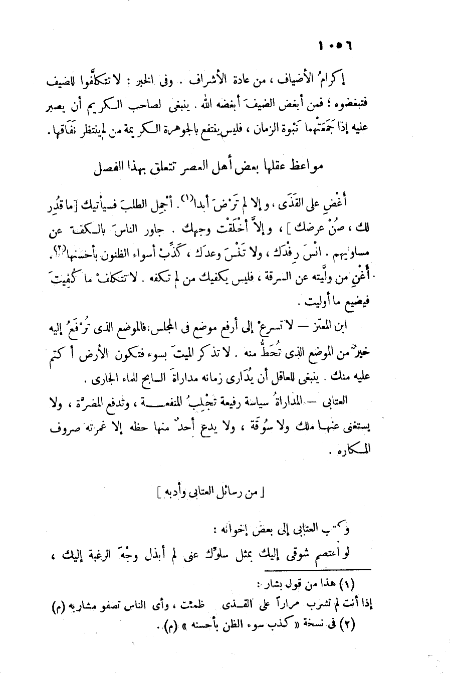 أغض على القذى، وإلا لم ترض أبدا «1» . أجمل الطلب فسيأتيك [ما قدر لك، صن عرضك] ، وإلّا أخلقت وجهك. جاور الناس بالكفّ عن مساويهم. انس رفدك، ولا تنس وعدك، كذّب أسواء الظنون بأحسنها «2» .