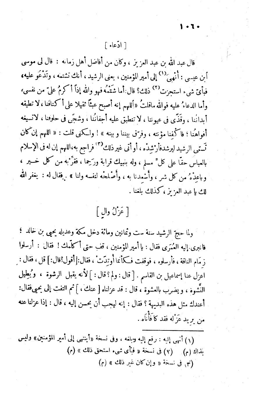 قال عبد الله بن عبد العزيز، وكان من أفاضل أهل زمانه: قال لى موسى ابن عيسى: أنهى «1» إلى أمير المؤمنين، يعنى الرشيد، أنك تشتمه، وتدعو عليه، فبأىّ شىء استجزت «2» ذلك؟ قال: أما شتمه فهو والله إذا أكرم علىّ من نفسى، وأما الدعاء عليه فوالله ما قلت «اللهم إنه أصبح عبئا ثقيلا على أكتافنا، لا تطيقه أبداننا، وقذى فى عيوننا، لا تنطبق عليه أجفاننا، وشجى فى حلوفنا، لا تسيغه أفواهنا؛ فاكفنا مؤنته، وفرّق بيننا وبينه» ! ولكنى قلت: «اللهم إن كان تسمّى الرشيد ليرشد فأرشده، أو أتى غير ذلك «3» فراجع به، اللهم إن له فى الإسلام بالعباس حقّا على كلّ مسلم، وله بنبيك قرابة ورحما، فقرّبه من كل خير، وباعده من كل شر، وأسعدنا به، وأصلحه لنفسه ولنا» . فقال له: يغفر الله لك يا عبد العزيز، كذلك بلغنا.