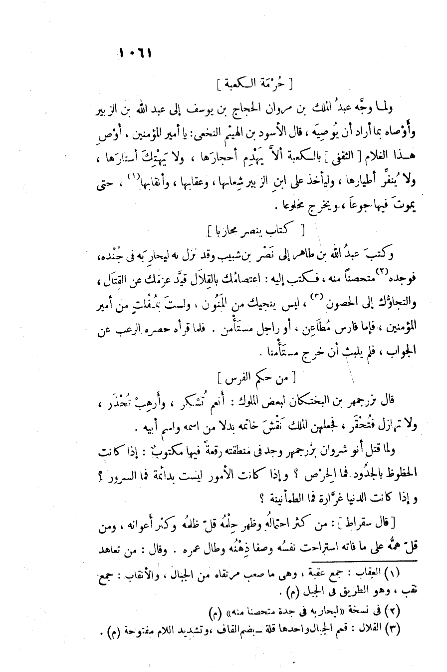 وكتب عبد الله بن طاهر إلى نصر بن شبيب وقد نزل به ليحاربه فى جنده، فوجده «2» متحصنا منه، فكتب إليه: اعتصامك بالقلال قيّد عزمك عن القتال، والتجاؤك إلى الحصون «3» ، ليس ينجيك من المنون، ولست بمفلت من أمير المؤمنين، فإما فارس مطاعن، أو راجل مستأمن. فلما قرأه حصره الرعب عن الجواب، فلم يلبث أن خرج مستأمنا.