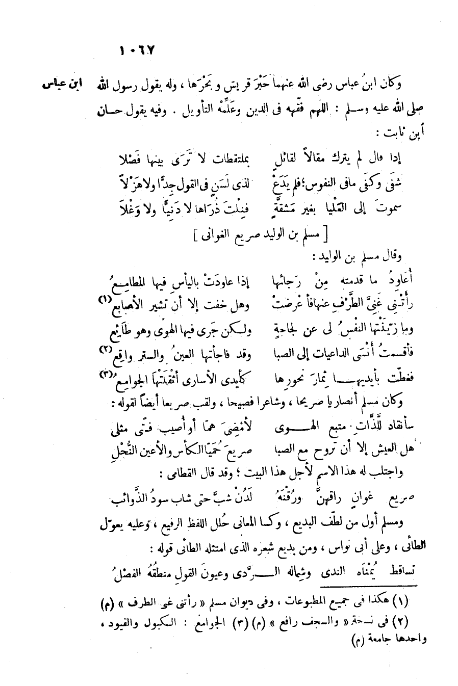 ومسلم أول من لطّف البديع، وكسا المعانى حلل اللفظ الرفيع، وعليه يعوّل الطائى، وعلى أبى نواس، ومن بديع شعره الذى امتثله الطائى قوله: