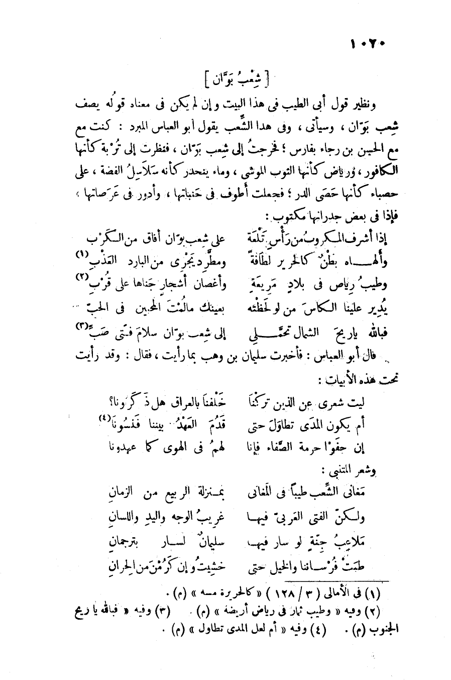ونظير قول أبى الطيب فى هذا البيت وإن لم يكن فى معناه قوله يصف شعب بوّان، وسيأتى، وفى هذا الشّعب يقول ابو العباس المبرد: كنت مع مع الحسين بن رجاء بفارس؛ فخرجت إلى شعب برّان، فنظرت إلى تربة كأنها الكافور، ورياض كأنها الثوب الموشى، وماء ينحدر كأنه سلاسل الفضة، على حصباء كأنها حصى الدر؛ فجعلت أطوف فى حنباتها، وأدور فى عرصاتها، فإذا فى بعض جدرانها مكتوب: