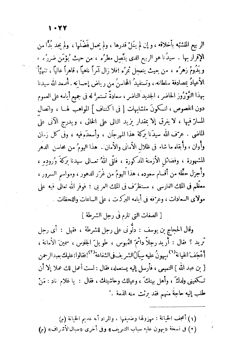 الربيع المتشبّه بأخلاقه، وإن لم ينل قدرها، ولم يحمل فضلها، ولم يجد بدّا من الإقرار بها. سيدنا هو الربيع الدى يتّصل مطره، من حيث يؤمن ضرره، ويدوم زهره، من حيث يتعجل ثمره؛ فلا زال آمرا ناهيا، قاهرا عاليا، تتهيّأ الأعياد بمصادفة سلطانه، وتستفيد المحاسن من رياض إحسانه. أسعد الله سيدنا بهذا النّوروز الحاضر، الجديد الناضر، سعادة تستمرّ له فى جميع أيامه على العموم دون الخصوص، لتكون متشابهات [فى اكتناف] المواهب لها، واتصال المسارّ فيها، لا يفرق إلا بمقدار يزيد التالى على الخالى، ويدرج الآنى على الماضى. عرّف الله سيدنا بركة هذا المهرجان، وأسعده فيه، وفى كل زمان وأوان، وأبقاه ما شاء فى ظلال الأمانى والأمان. هذا اليوم من محاسن الدهر المشهورة، وفضائل الأزمنة المذكورة، فلقّى الله تعالى سيدنا بركة وروده، وأجزل حظّه من أقسام سعوده، هذا اليوم من غرر الدهور، ومواسم السرور، معظّم فى الملك الفارسى، مستظرف فى الملك العربى؛ فوفر الله تعالى فيه على مولاى السعادات، وعرّفه فى أيامه البركات، على الساعات واللحظات