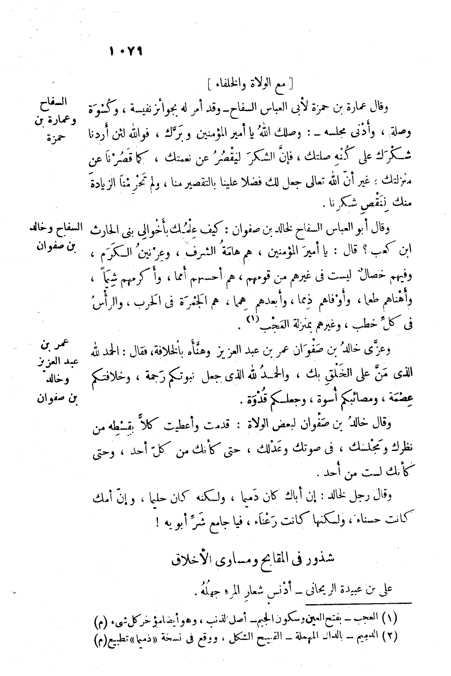 وقال عمارة بن حمزة لأبى العباس السفاح- وقد أمر له بجوائز نفيسة، وكسوة وصلة، وأدنى مجلسه-: وصلك الله يا أمير المؤمنين وبرّك، فوالله لئن أردنا شكرك على كنه صلتك، فإنّ الشكر ليقصر عن نعمتك، كما قصرنا عن منزلتك، غير أنّ الله تعالى جعل لك فضلا علينا بالتقصير منا، ولم تحرمنا الزيادة منك لنقص شكرنا.
