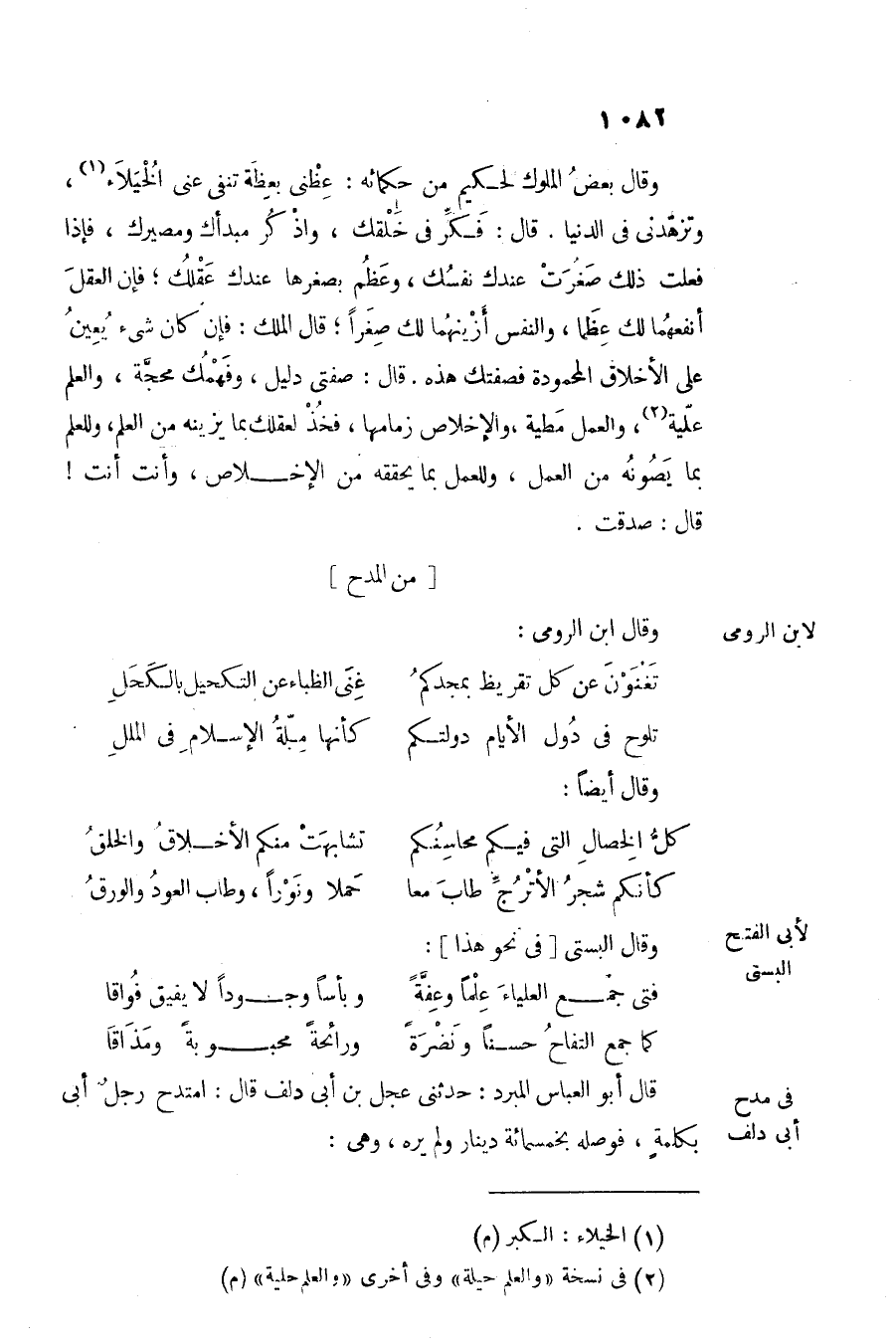 وقال بعض الملوك لحكيم من حكمائه: عظنى بعظة تنفى عنى الخيلاء «1» ، وتزهّدنى فى الدنيا. قال: فكّر فى خلقك، واذكر مبدأك ومصيرك، فإذا فعلت ذلك صغرت عندك نفسك، وعظم بصغرها عندك عقلك؛ فإن العقل أنفعها لك عظما، والنفس أزينهما لك صغرا؛ قال الملك: فإن كان شىء يعين على الأخلاق المحمودة فصفتك هذه. قال: صفتى دليل، وفهمك محجّة، والعلم علية «2» ، والعمل مطية، والإخلاص زمامها، فخذ لعقلك بما يزينه من العلم، وللعلم بما يصونه من العمل، وللعمل بما يحققه من الإخلاص، وأنت أنت! قال: صدقت.