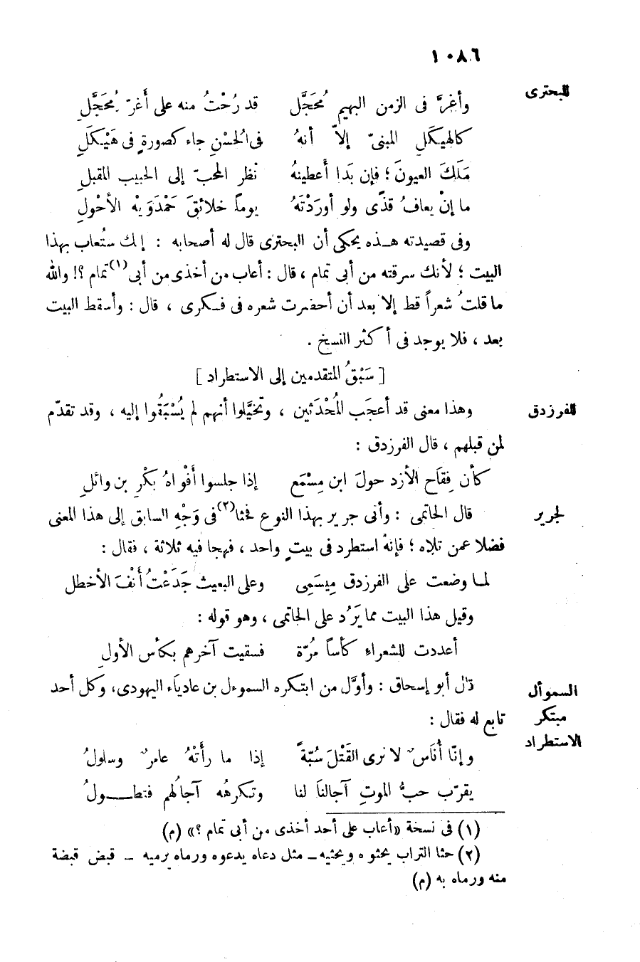 وفى قصيدته هذه يحكى أن البحترى قال له أصحابه: إنك ستعاب بهذا البيت؛ لأنك سرقته من أبى تمام، قال: أعاب من أخذى من أبى «1» تمام؟! والله ما قلت شعرا قط إلا بعد أن أحضرت شعره فى فكرى، قال: وأسقط البيت بعد، فلا يوجد فى أكثر النسخ.