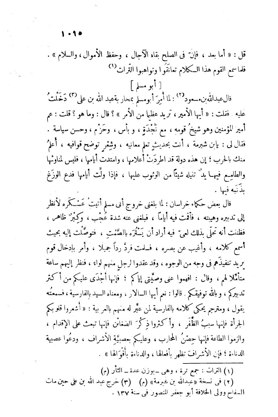 قال عبد الله بن مسعود «2» : لما أمر أبو مسلم بمحاربة عبد الله بن على «3» دخلت عليه فقلت: «أيها الأمير، تريد عظيما من الأمر» ؟ قال: وما هو؟ قلت: عم أمير المؤمنين وهو شيخ قومه، مع نجدة، وبأس، وحزم، وحسن سياسة.