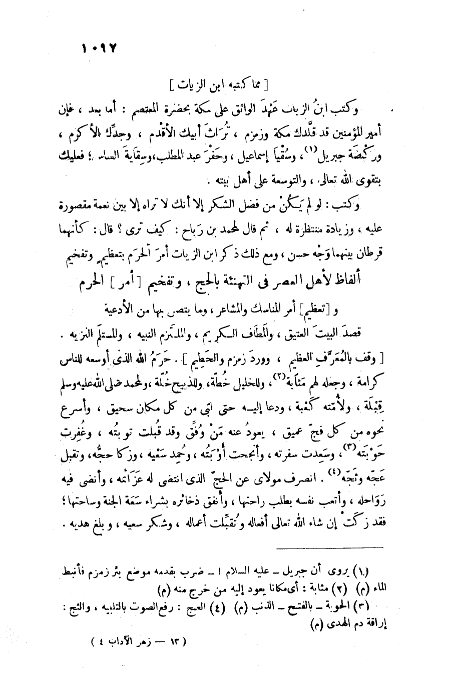 وكتب ابن الزيات عهد الواثق على مكة بحضرة المعتصم: أما بعد، فإن أمير المؤمنين قد قلّدك مكة وزمزم، تراث أبيك الأقدم، وجدّك الأكرم، وركضة جبريل «1» ، وسقيا إسماعيل، وحفر عبد المطلب، وسقاية العباس؛ فعليك بتقوى الله تعالى، والتوسعة على أهل بيته.