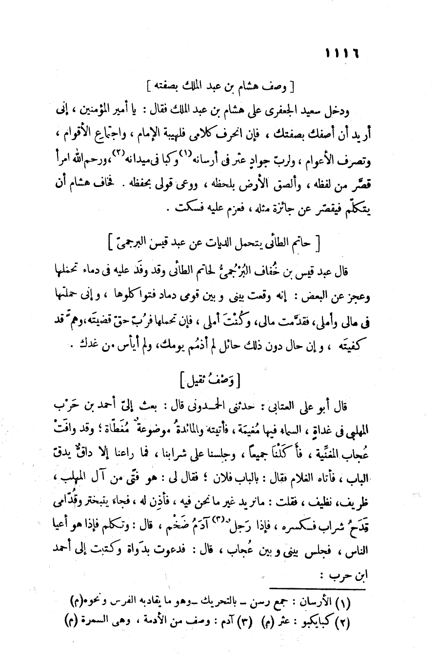 ودخل سعيد الجعفرى على هشام بن عبد الملك فقال: يا أمير المؤمنين، إنى أريد أن أصفك بصفتك، فإن انحرف كلامى فلهيبة الإمام، واجتماع الأقوام، وتصرف الأعوام، ولربّ جواد عثر فى أرسانه «1» وكبا فى ميدانه «2» ، ورحم الله امرأ قصّر من لفظه، وألصق الأرض بلحظه، ووعى قولى بحفظه. فخاف هشام أن يتكلّم فيقصّر عن جائزة مثله، فعزم عليه فسكت.