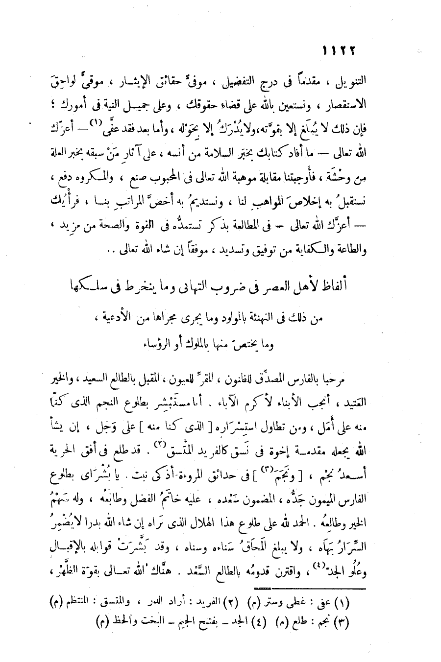مرحبا بالفارس المصدّق للظنون، المقرّ للعيون، المقبل بالطالع السعيد، والخير العتيد، أنجب الأبناء لأكرم الآباء. أنا مستبشر بطلوع النجم الذى كنّا منه على أمل، ومن تطاول استسراره [الذى كنا منه] على وجل، إن يشأ الله يجعله مقدمة إخوة فى نسق كالفريد المتّسق «2» . قد طلع فى أفق الحرية أسعد نجم، [ونجم «3» ] فى حدائق المروءة أذكى نبت. يا بشراى بطلوع الفارس الميمون جدّه، المضمون سعده، عليه خاتم الفضل وطابعه، وله سهم الخير وطالعه. الحمد لله على طلوع هذا الهلال الذى نراه إن شاء الله بدرا لا يضمر السّرار بهاه، ولا يبلغ المحاق سناءه وسناه، وقد بشّرت قوابله بالإقبال وعلو الجدّ «4» ، واقترن قدومه بالطالع السّعد. هنّاك الله تعالى بقوّة الظّهر،
