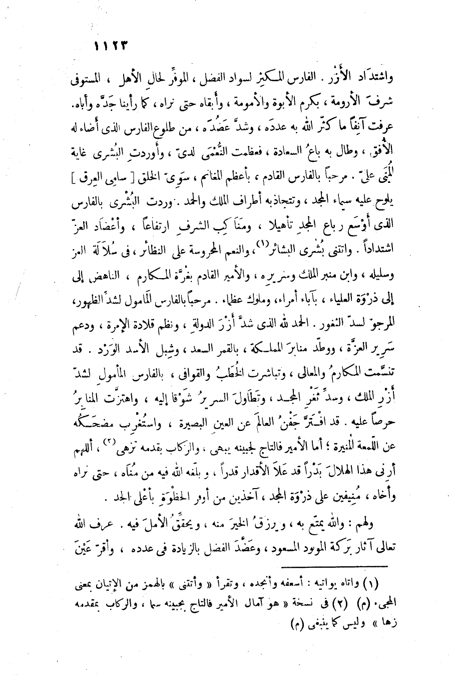 واشتداد الأزر. الفارس المكثر لسواد الفضل، الموفّر لحال الأهل، المستوفى شرف الأرومة، بكرم الأبوة والأمومة، وأبقاه حتى نراه، كما رأينا جدّه وأباه.