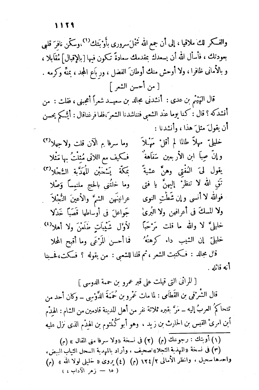 قال الهيثم بن عدى: أنشدنى مجالد بن سعيد شعرا أعجبنى، فقلت: من أنشدكه؟ قال: كنا يوما عند الشعبى فتناشدنا الشعر، فلما فرغنا قال: أيّكم يحسن أن يقول مثل هذا، وأنشدنا: