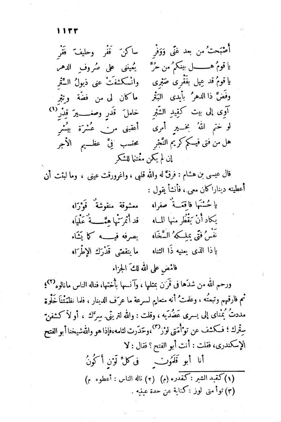 قال عيسى بن هشام: فرقّ له والله قلبى، واغرورقت عينى، وما لبثت أن أعطيته دينارا كان معى، فأنشأ يقول: