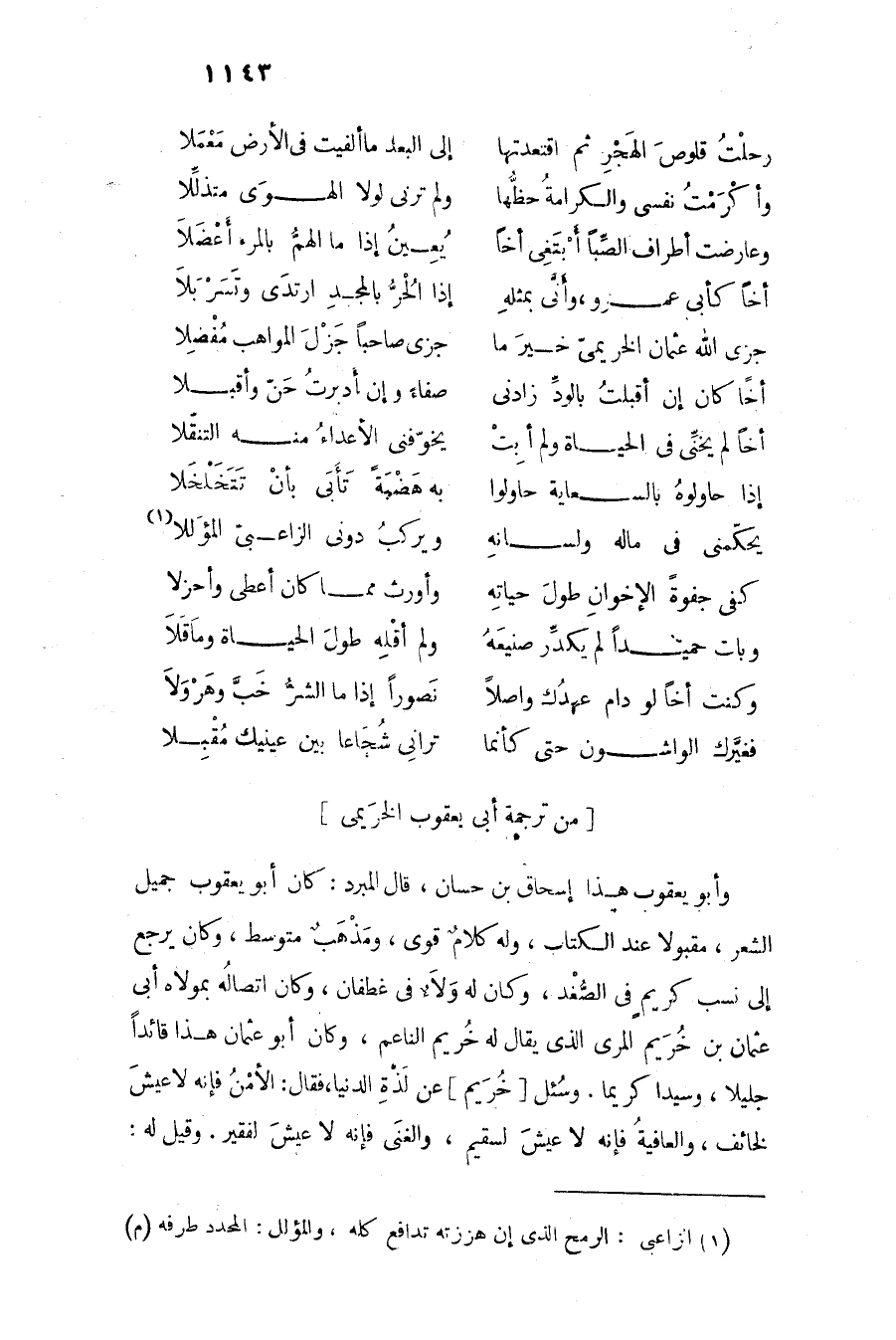 وأبو يعقوب هذا إسحاق بن حسان، قال المبرد: كان أبو يعقوب جميل الشعر، مقبولا عند الكتاب، وله كلام قوى، ومذهب متوسط، وكان يرجع إلى نسب كريم فى الصّغد، وكان له ولاء فى غطفان، وكان اتصاله بمولاه أبى عثمان بن خريم المرى الذى يقال له خريم الناعم، وكان أبو عثمان هذا قائدا جليلا، وسيدا كريما. وسئل [خريم] عن لذة الدنيا، فقال: الأمن فإنه لا عيش لخائف، والعافية فإنه لا عيش لسقيم، والغنى فإنه لا عيش لفقير. وقيل له: