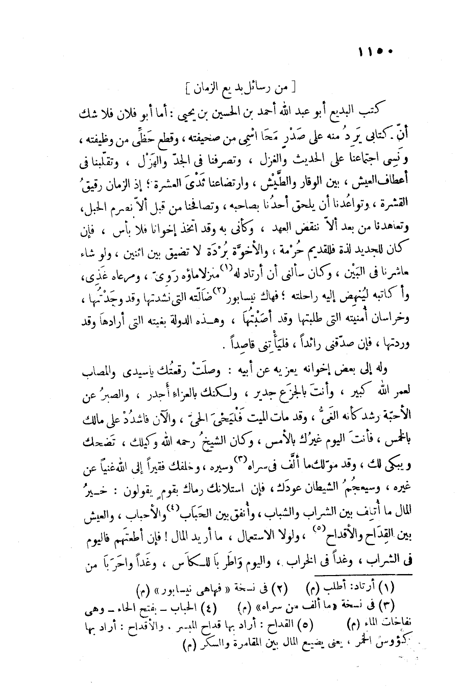 كتب البديع أبو عبد الله أحمد بن الحسين بن يحيى: أما أبو فلان فلا شك أنّ كتابى يرد منه على صدر محا اسمى من صحيفته، وقطع حظّى من وظيفته، ونسى اجتماعنا على الحديث والغزل، وتصرفنا فى الجدّ والهزل، وتقلّبنا فى أعطاف العيش، بين الوقار والطّيش، وارتضاعنا ثدى العشرة؛ إذ الزمان رقيق القشرة، وتواعدنا أن يلحق أحدنا بصاحبه، وتصافحنا من قبل ألّا نصرم الحبل، وتعاهدنا من بعد ألّا ننقض العهد، وكأنى به وقد اتخذ إخوانا فلا بأس، فإن كان للجديد لذة فللقديم حرمة، والأخوّة بردة لا تضيق بين اثنين، ولو شاء معاشرنا فى البين، وكان سألنى أن أرتاد له «1» منزلا ماؤه روىّ، ومرعاه غذى، وأكاتبه لينهض إليه راحلته؛ فهاك نيسابور «2» ضالّته التى نشدتها وقد وجدتها، وخراسان أمنيته التى طلبتها وقد أصبتها، وهذه الدولة بغيته التى أرادها وقد وردتها، فإن صدّقنى رائدا، فليأتنى قاصدا.