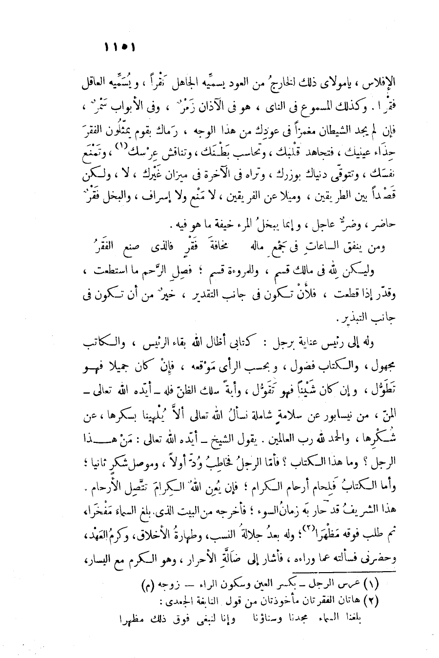 الإفلاس، يا مولاى ذلك الخارج من العود يسمّيه الجاهل نقرا، ويسمّيه العاقل فقرا. وكذلك المسموع فى الناى، هو فى الآذان زمر، وفى الأبواب سمر، فإن لم يجد الشيطان مغمزا فى عودك من هذا الوجه، رماك بقوم يمثّلون الفقر حذاء عينيك، فتجاهد قلبك، وتحاسب بطنك، وتناقش عرسك «1» ، وتمنع نفسك، وتتوقّى دنياك بوزرك، وتراه فى الآخرة فى ميزان غيرك، لا، ولكن قصدا بين الطريقين، وميلا عن الفريقين، لا منع ولا إسراف، والبخل فقر حاضر، وضرّ عاجل، وإنما يبخل المرء خيفة ما هو فيه.