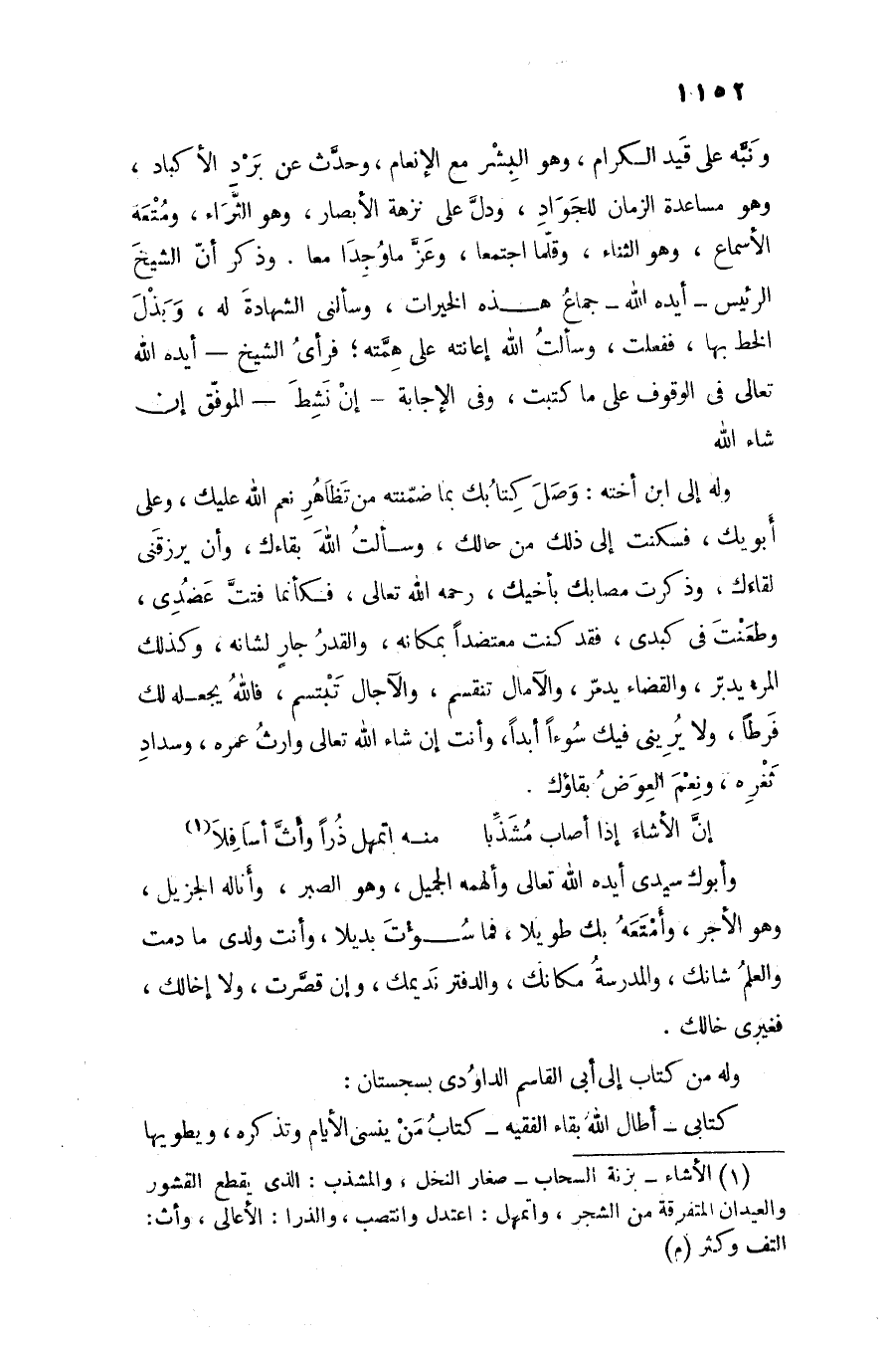 ونبّه على قيد الكرام، وهو البشر مع الإنعام، وحدّث عن برد الأكباد، وهو مساعدة الزمان للجواد، ودلّ على نزهة الأبصار، وهو الثّراء، ومتعه الأسماع، وهو الثناء، وقلّما اجتمعا، وعزّ ما وجدا معا. وذكر أنّ الشيخ الرئيس- أيده الله- جماع هذه الخيرات، وسألنى الشهادة له، وبذل الخط بها، ففعلت، وسألت الله إعانته على همّته؛ فرأى الشيخ- أيده الله تعالى فى الوقوف على ما كتبت، وفى الإجابة- إن نشط- الموفّق إن شاء الله وله إلى ابن أخته: وصل كتابك بما ضمّنته من تظاهر نعم الله عليك، وعلى أبويك، فسكنت إلى ذلك من حالك، وسألت الله بقاءك، وأن يرزقنى لقاءك، وذكرت مصابك بأخيك، رحمه الله تعالى، فكأنما فتتّ عضدى، وطعنت فى كبدى، فقد كنت معتضدا بمكانه، والقدر جار لشانه، وكذلك المرء يدبّر، والقضاء يدمّر، والآمال تنقسم، والآجال تبتسم، فالله يجعله لك فرطا، ولا يرينى فيك سوءا أبدا، وأنت إن شاء الله تعالى وارث عمره، وسداد ثغره، ونعم العوض بقاؤك.
