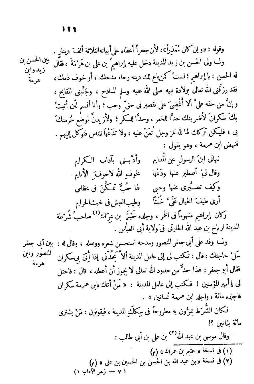 ولما ولى الحسن بن زيد المدينة دخل عليه إبراهيم بن على بن هرمة، فقال له الحسن: يا إبراهيم؛ لست كمن باع لك دينه رجاء مدحك، أو خوف ذمك، فقد رزقنى الله تعالى بولادة نبيه صلى الله عليه وسلم الممادح، وجنّبنى المقابح، وإنّ من حقه علىّ ألا أغضى على تقصير في حقّ وجب؛ وأنا أقسم لئن أتيت بك سكران لأضربنك حدّا للخمر، وحدّا للسكر؛ ولأزيدنّ لموضع حرمتك بى، فليكن تركك لها لله عز وجل تعن عليه، ولا تدعها للناس فتوكل إليهم.