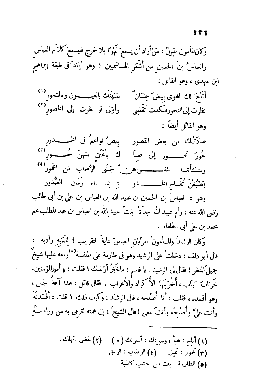 وكان المأمون يقول: من أراد أن يسمع لهوا بلا حرج فليسمع كلام العباس والعباس بن الحسين بن أشعر الهاشميين؛ وهو يعدّ في طبقة إبراهيم ابن المهدى، وهو القائل:
