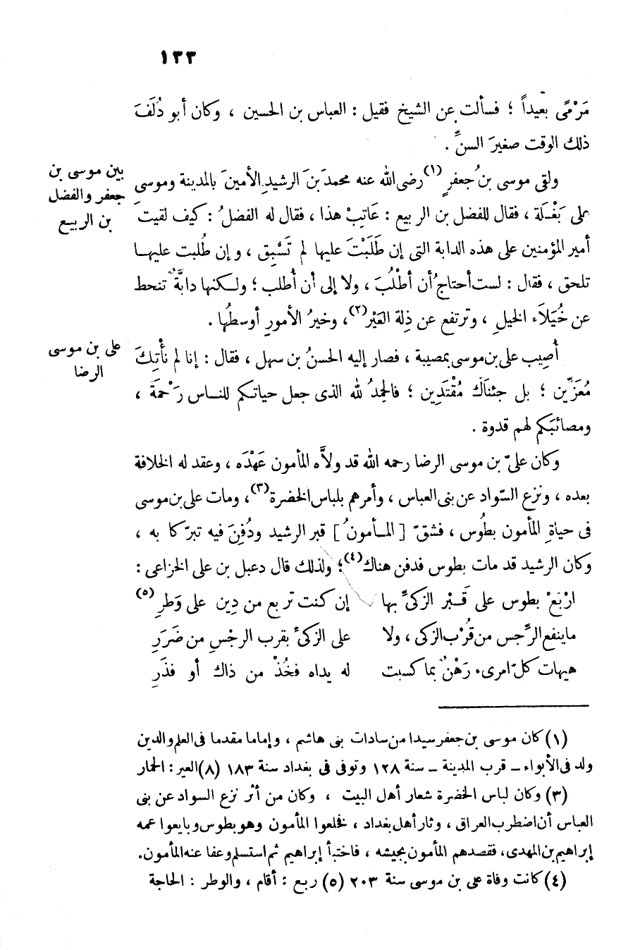 وكان علىّ بن موسى الرضا رحمه الله قد ولّاه المأمون عهده، وعقد له الخلافة بعده، ونزع السّواد عن بنى العباس، وأمرهم بلباس الخضرة «3» ، ومات على بن موسى فى حياة المأمون بطوس، فشقّ [المأمون] قبر الرشيد ودفن فيه تبرّكا به، وكان الرشيد قد مات بطوس فدفن هناك «4» ؛ ولذلك قال دعبل بن على الخزاعى: