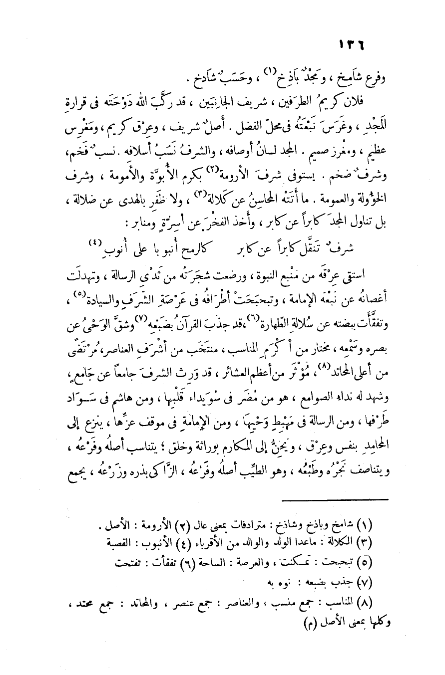 فلان كريم الطرفين، شريف الجانبين، قد ركّب الله دوحته في قرارة المجد، وغرس نبعته في محل الفضل. أصل شريف، وعرق كريم، ومغرس عظيم، ومغرز صميم. المجد لسان أوصافه، والشرف نسب أسلافه. نسب فخم، وشرف ضخم. يستوفى شرف الأرومة «2» بكرم الأبوّة والأمومة، وشرف الخؤولة والعمومة. ما أتته المحاسن عن كلالة «3» ولا ظفر بالهدى عن ضلالة، بل تناول المجد كابرا عن كابر، وأخذ الفخر عن أسرّة ومنابر: