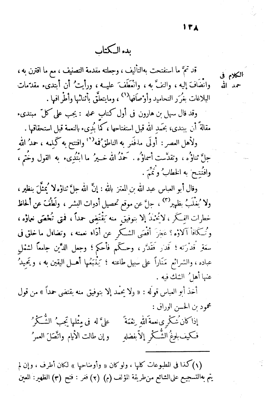 وقد قال سهل بن هارون في أول كتاب عمله: يجب على كلّ مبتدىء مقالة أن يبتدىء بحمد الله قبل استفتاحها، كما بدىء بالنعمة قبل استحقاقها.