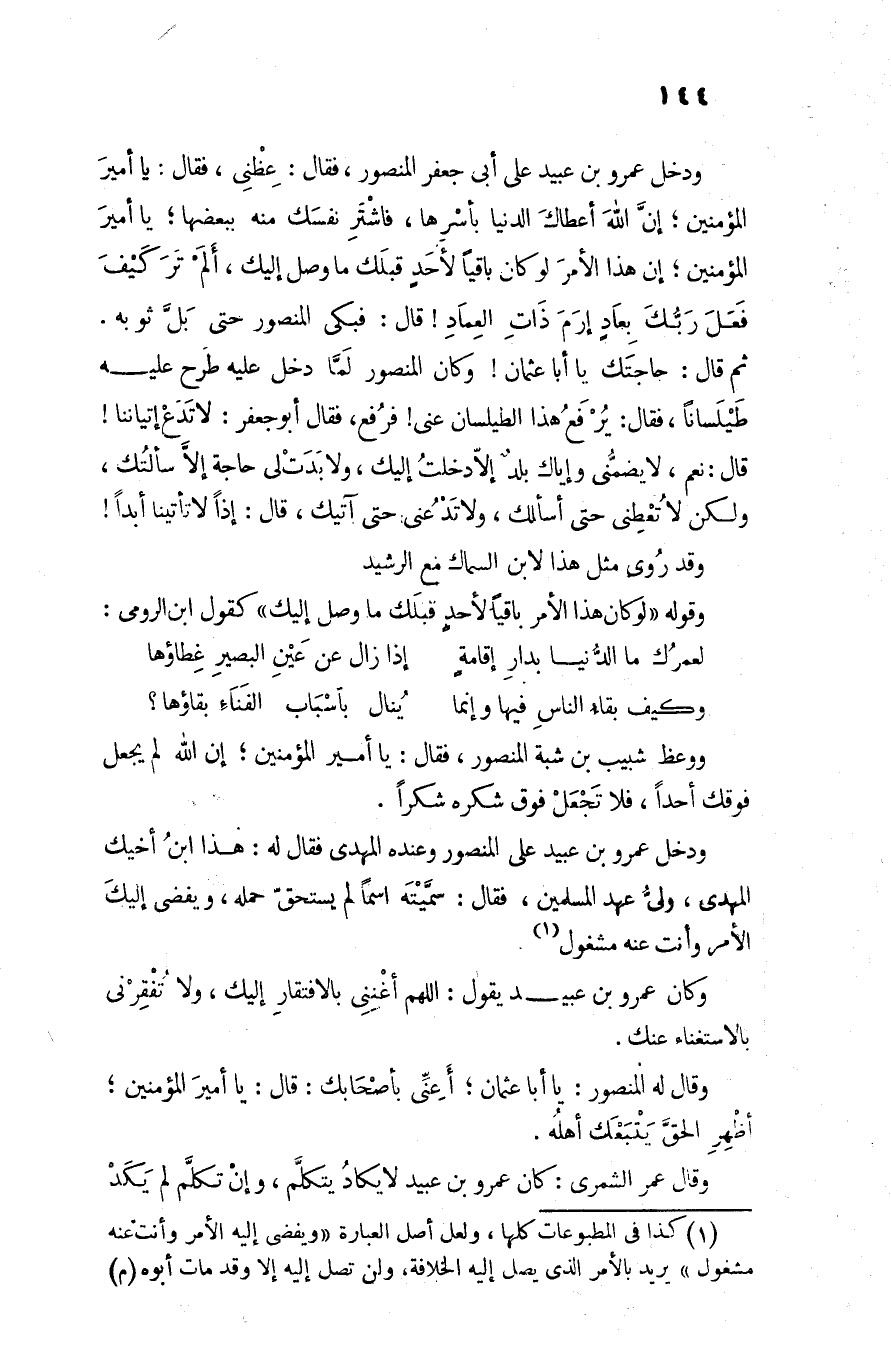 ثم قال: حاجتك يا أبا عثمان! وكان المنصور لمّا دخل عليه طرح عليه طيلسانا، فقال: يرفع هذا الطيلسان عنى! فرفع، فقال أبو جعفر: لا تدع إتياننا! قال: نعم، لا يضمّنى وإياك بلد إلّا دخلت إليك، ولا بدت لى حاجة إلّا سألتك، ولكن لا تعطنى حتى أسألك، ولا تدعنى حتى آتيك، قال: إذا لا تأتينا أبدا! وقد روى مثل هذا لابن السماك مع الرشيد وقوله «لو كان هذا الأمر باقيا لأحد قبلك ما وصل إليك» كقول ابن الرومى: