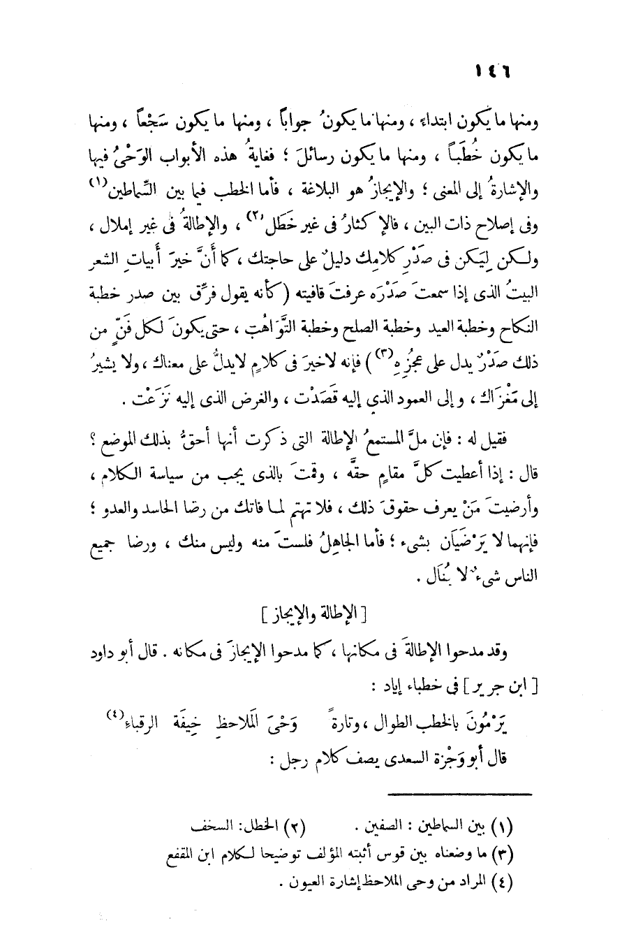 ومنها ما يكون ابتداء، ومنها ما يكون جوابا، ومنها ما يكون سجعا، ومنها ما يكون خطبا، ومنها ما يكون رسائل؛ فغاية هذه الأبواب الوحى فيها والإشارة إلى المعنى؛ والإيجاز هو البلاغة، فأما الخطب فيما بين السّماطين «1» وفي إصلاح ذات البين، فالإكثار في غير خطل «2» ، والإطالة في غير إملال، ولكن ليكن في صدر كلامك دليل على حاجتك، كما أنّ خير أبيات الشعر البيت الذى إذا سمعت صدره عرفت قافيته (كأنه يقول فرّق بين صدر خطبة النكاح وخطبة العيد وخطبة الصلح وخطبة التّواهب، حتى يكون لكل فنّ من ذلك صدر يدل على عجزه «3» ) فإنه لا خير في كلام لا يدلّ على معناك، ولا يشير إلى مغزاك، وإلى العمود الذى إليه قصدت، والغرض الذى إليه نزعت.