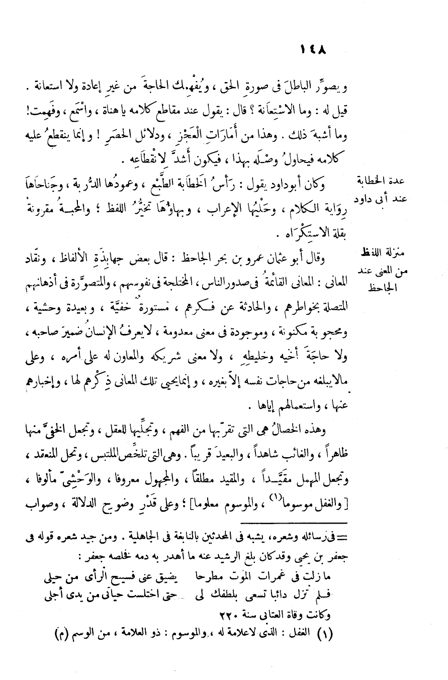 وقال أبو عثمان عمرو بن بحر الجاحظ: قال بعض جهابذة الألفاظ، ونقّاد المعانى: المعانى القائمة في صدور الناس، المختلجة في نفوسهم، والمتصوّرة في أذهانهم المتصلة بخواطرهم، والحادثة عن فكرهم، مستورة خفيّة، وبعيدة وحشية، ومحجوبة مكنونة، وموجودة في معنى معدومة، لا يعرف الإنسان ضمير صاحبه، ولا حاجة أخيه وخليطه، ولا معنى شريكه والمعاون له على أمره، وعلى ما لا يبلغه من حاجات نفسه إلّا بغيره، وإنما يحيى تلك المعانى ذكرهم لها، وإخبارهم عنها، واستعمالهم إياها.