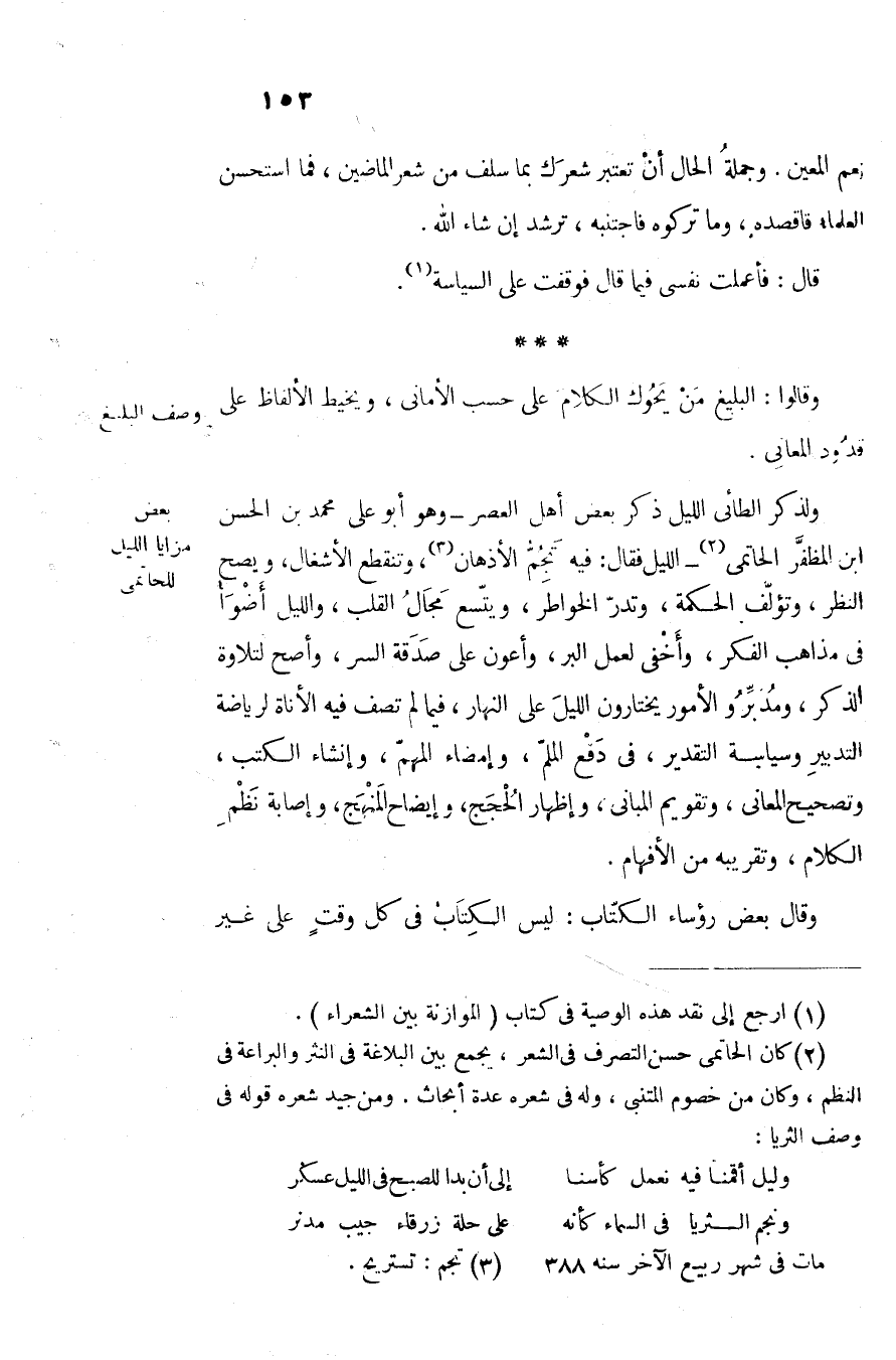 ولذكر الطائى الليل ذكر بعض أهل العصر- وهو أبو على محمد بن الحسن ابن المظفّر الحاتمى «2» - الليل فقال: فيه تجمّ الأذهان «3» ، وتنقطع الأشغال، ويصح النظر، وتؤلّف الحكمة، وتدرّ الخواطر، ويتّسع مجال القلب، والليل أضوأ فى مذاهب الفكر، وأخفى لعمل البر، وأعون على صدقة السر، وأصح لتلاوة الذكر، ومدبّر والأمور يختارون الليل على النهار، فيما لم تصف فيه الأناة لرياضة التدبير وسياسة التقدير، فى دفع الملّم، وإمضاء المهمّ، وإنشاء الكتب، وتصحيح المعانى، وتقويم المبانى، وإظهار الحجج، وإيضاح المنهج، وإصابة نظم الكلام، وتقريبه من الأفهام.