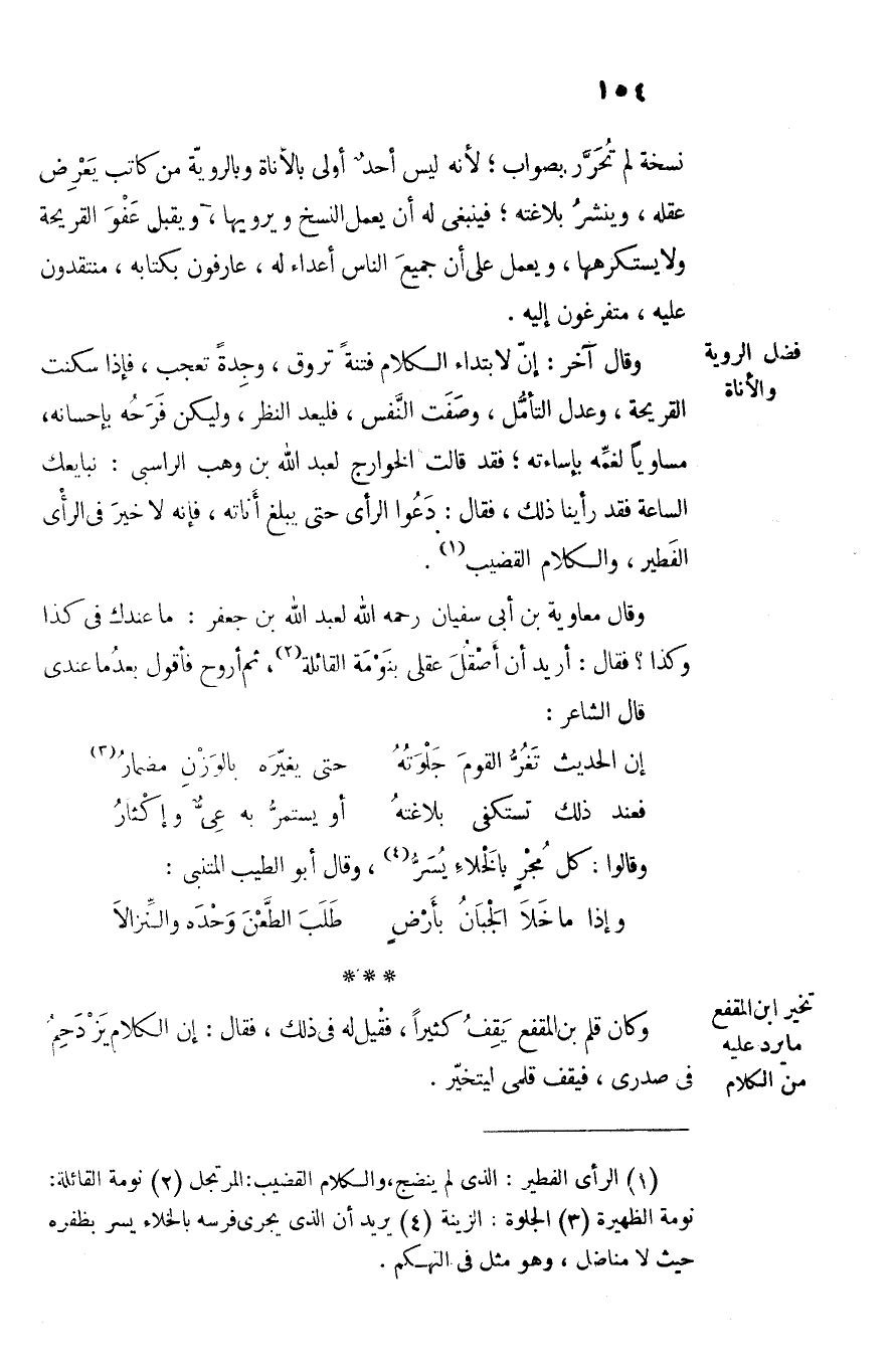 نسخة لم تحرّر بصواب؛ لأنه ليس أحد أولى بالأناة وبالرويّة من كاتب يعرض عقله، وينشر بلاغته؛ فينبغى له أن يعمل النسخ ويرويها، ويقبل عفو القريحة ولا يستكرهها، ويعمل على أن جميع الناس أعداء له، عارفون بكتابه، منتقدون عليه، متفرغون إليه.