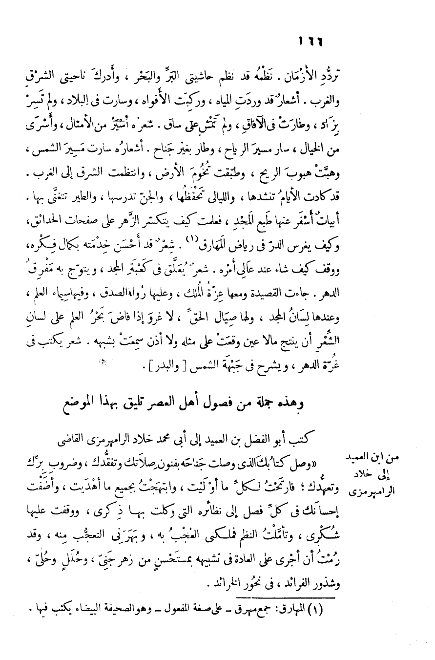 كتب أبو الفضل بن العميد إلى أبى محمد خلاد الرامهرمزى القاضى «وصل كتابك الذى وصلت جناحه بفنون صلاتك وتفقّدك، وضروب برّك وتعهّدك؛ فارتحت لكلّ ما أوليت، وابتهجت بجميع ما أهديت، وأضفت إحسانك في كلّ فصل إلى نظائره التي وكلت بها ذكرى، ووقفت عليها شكرى، وتأمّلت النظم فملكنى العجب به، وبهرنى التعجّب منه، وقد رمت أن أجرى على العادة في تشبيهه بمستحسن من زهر جنىّ، وحلل وحلىّ، وشذور الفرائد، فى نحور الخرائد.