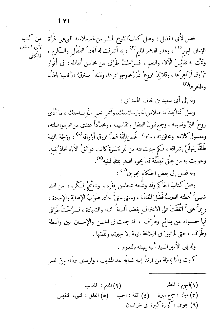 فصل لأبى الفضل: وصل كتاب الشيخ المبشر من خبر سلامته التي هي غرّة الزمان البهيم «1» ، وعذر الدهر المليم «2» ، بما أشرقت له آفاق الفضل والكرم، وتمّت به نفائس الآلاء والنعم، فسرّحت طرفى من محاسن ألفاظه، فى أنوار تروق أزاهرها، وقلائد تروع دررها وجواهرها، ومبارّ يسترقّ الرّقاب باطنها وظاهرها «3» وله إلى أبى سعيد بن خلف الهمدانى: